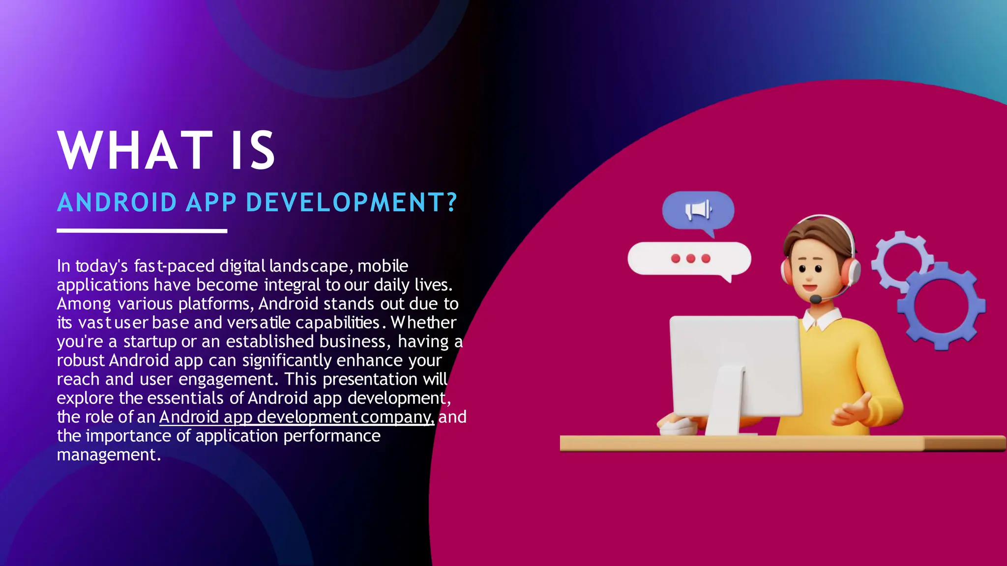 The document discusses the essentials of Android app development, highlighting its relevance in today's digital landscape and the benefits of choosing Android as a platform for businesses. It outlines key steps in app development, the importance of selecting a competent development company, and best practices to enhance app performance and security. Additionally, it touches on challenges faced in development and future trends such as AI integration, IoT, AR/VR, and the impact of 5G technology.