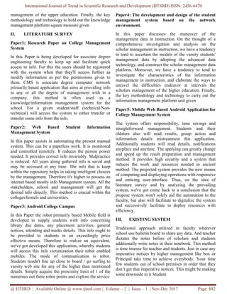 This document describes a proposed Android app for a college management system. The app would allow faculty to share important information and notifications with students. It includes OTP login for teachers, administrators, and principals along with student login. Faculty could upload documents, notes, attendance updates, and more through the app. Students could view information and notifications for their semester. The app aims to increase efficiency of record management, decrease time to access records, and make the system more secure compared to traditional bulletin board-based methods. Future work includes implementing K-means clustering and authentication algorithms in the app.