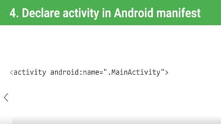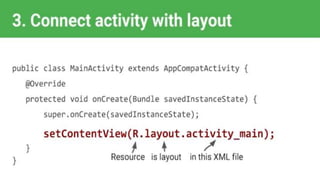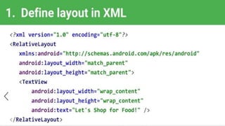 The document covers the fundamentals of Android application development, focusing on views, view groups, layouts, event handling, and activity implementation. It describes how to manage user interface components and interaction through various classes, including common layout classes and intent types. Additionally, it outlines the lifecycle of an activity and the significance of handling events in the application context.