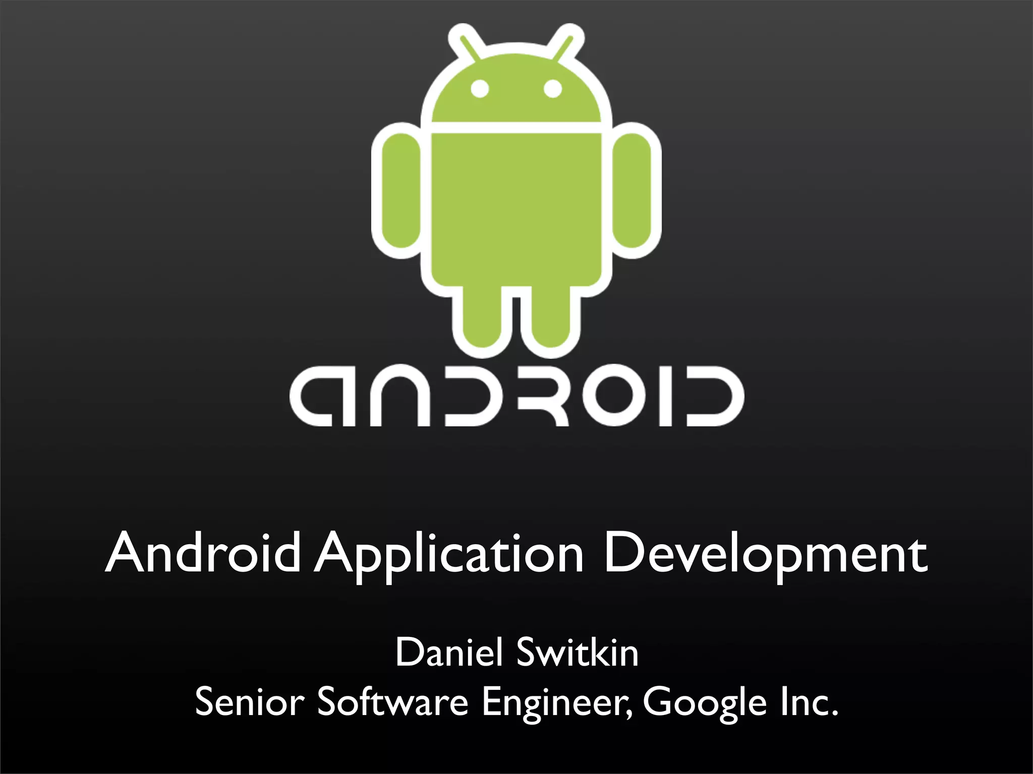 This document provides an overview of Android application development. It introduces key concepts like the Android system architecture with multiple application components running on top of an Linux kernel. It demonstrates a simple "Hello World" application and covers major application components like Activities, Services, BroadcastReceivers and ContentProviders. It also discusses practical matters like storage, packaging, resources and application lifecycle. Finally, it introduces the Android development toolchain including the emulator, Eclipse plugin and debugging tools.