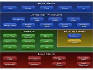 This document outlines a tutorial-driven course on Android application development using Java, covering both basic and advanced topics. It explains the Android platform's architecture, application components like activities and services, and development tools like Eclipse and the Android SDK. The course objectives include understanding mobile app development, application building blocks, and utilizing the emulator for testing.