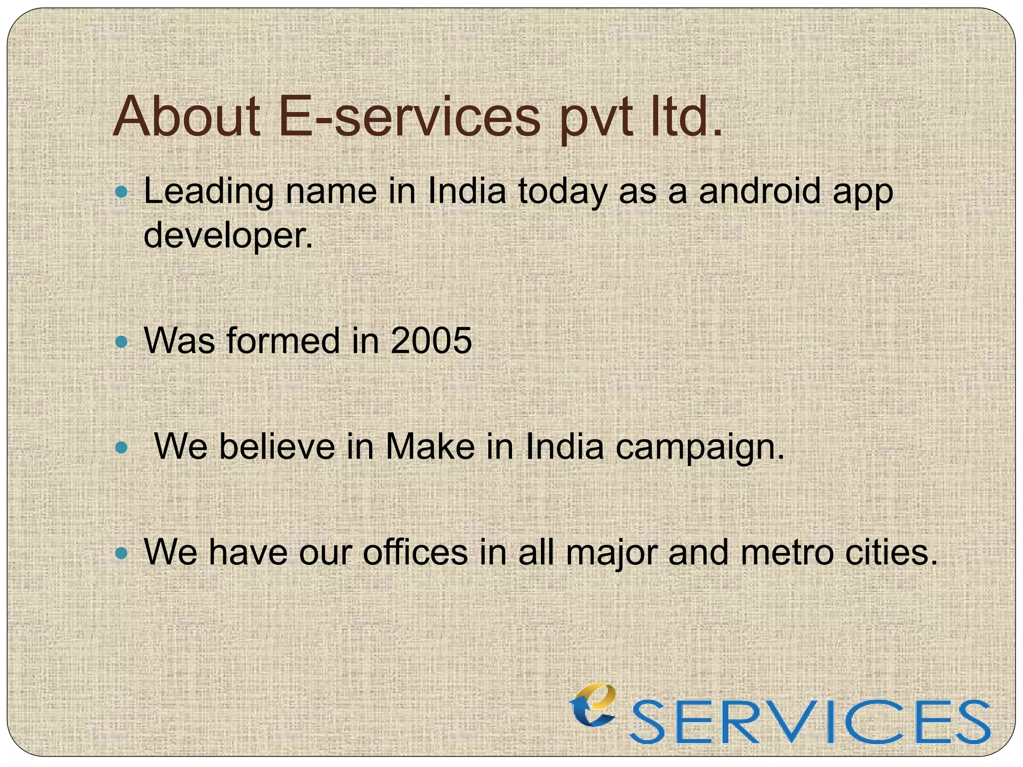 E-Services Pvt Ltd is a prominent Android app development company in India, established in 2005, with a focus on the 'Make in India' campaign and offices in major cities. The company has successfully developed over 100 applications across various categories, emphasizing a structured process from needs assessment to delivery and maintenance. With a commitment to quality and timely updates, E-Services caters to notable clients including major banks and hospitals.