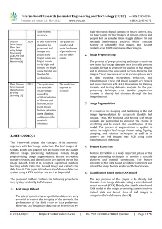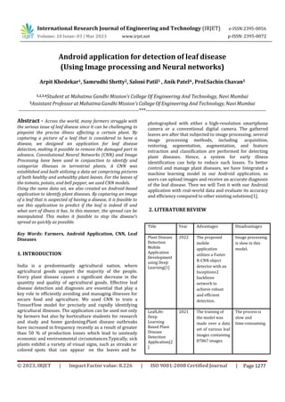 This document describes an Android application for detecting leaf diseases using image processing and neural networks. The application uses a convolutional neural network (CNN) model trained on a dataset of images of healthy and unhealthy plant leaves. The CNN classifies leaf images uploaded by users to identify the disease and provide an accurate diagnosis. The application aims to help farmers and students quickly identify plant diseases to control their spread and reduce agricultural losses. It analyzes leaf images using techniques like preprocessing, augmentation, feature extraction, and classification with a CNN architecture. The trained model is integrated into an Android application using TensorFlow Lite to enable real-time disease detection from smartphone photos of leaves.