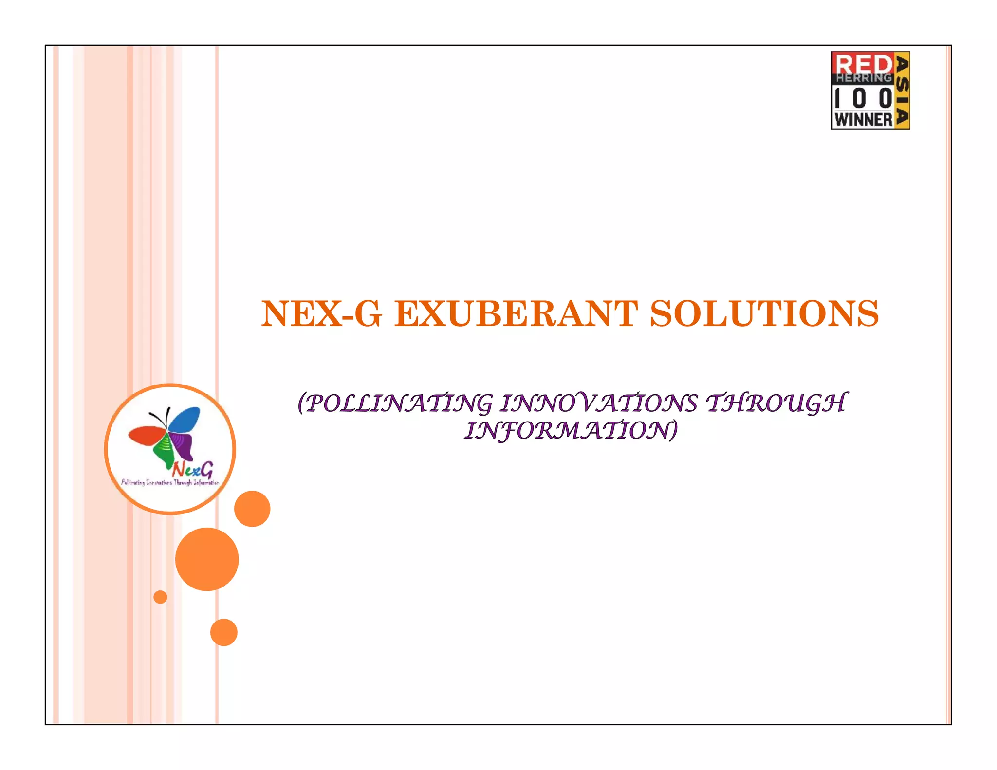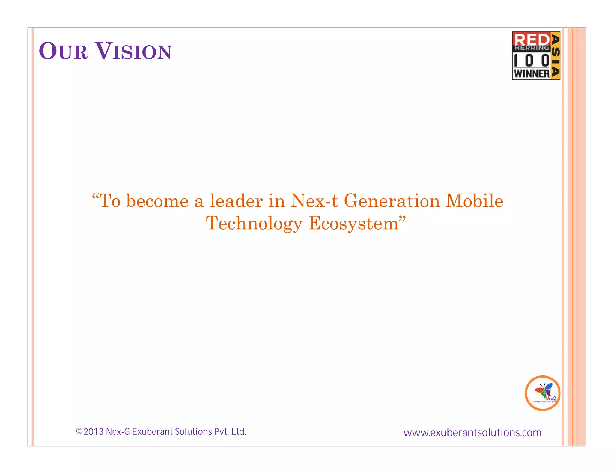 Nex-G Exuberant Solutions is a mobile technology company that provides training and consultancy services. Its vision is to be a leader in next generation mobile technologies. It aims to achieve high quality standards in technology consultancy, experts, and software solutions for next generation mobile technologies. The company provides training in areas such as mobile and network applications, protocol stack development and testing, and telecom and wireless technology.