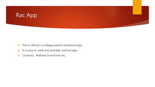 This document summarizes three Android apps: the R.A. College app which provides college website, timetable and email access in an easy to use format; the Blogger app which allows users to login with their Gmail account to access and modify blogs; and Ganesh Kavhar's professional app containing details about himself. It concludes by providing a website and email contact.