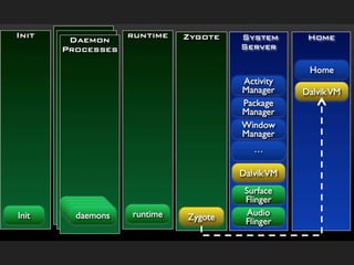 The document discusses the architecture of the Android operating system. It describes Android running on a Linux kernel which provides core system services like memory management and security. It then explains the different layers that make up the Android runtime, including the bootloader, init process, zygote process, Dalvik virtual machine and system server. Finally, it notes that system services bind to the service manager to complete the startup of the Android system.