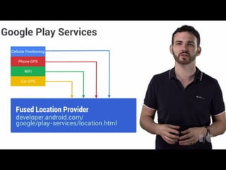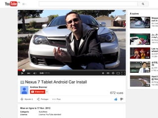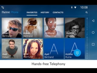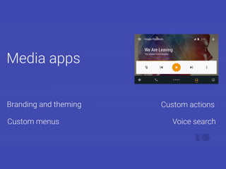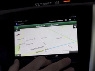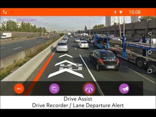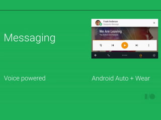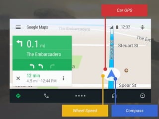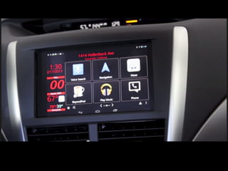 Android Auto is a platform that allows users to safely access apps and services from their Android phones on supported car infotainment systems. It solves issues with current navigation systems by providing up-to-date traffic info, automatic map updates, and a more familiar user experience when your phone is plugged in. Key features include an overview with Google Now, customized navigation with Google Maps, access to music services like Google Play Music, and voice commands through Google Now for notifications and car services such as roadside assistance.