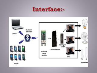This document describes a home automation system that allows users to control devices in their home from their mobile phone using Bluetooth. The system connects an Android phone to a microcontroller using a Bluetooth module. The user can then control electrical devices and appliances connected to relays through the microcontroller. This provides convenience and accessibility from anywhere. It also improves energy efficiency and security for homes.