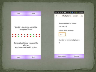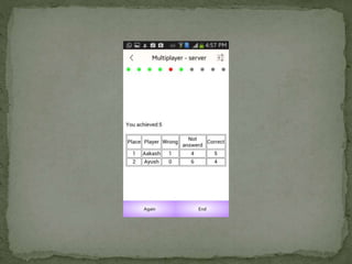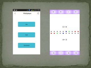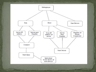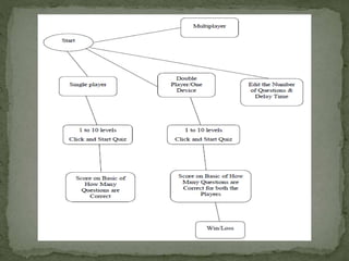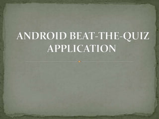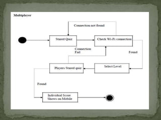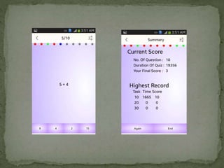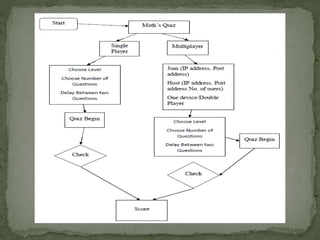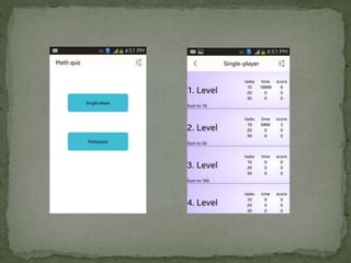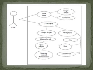 The document outlines the 'Math Quiz' application for Android, designed to engage students in solving mathematical expressions through various levels of challenge. Key features include single-player, two-player, and multiplayer modes, along with a scoring system and database integration using SQLite. The app serves as a tool to enhance mathematical skills and offers potential for expansion into other educational domains.