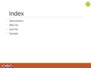 The document discusses buttons in Android applications. It explains that buttons can contain text or images and are defined in XML layout files using <Button> elements. The document also provides an example XML layout file with an ImageButton and Button, and the corresponding Java code to set onclick listeners for the buttons and display Toast messages when each button is clicked.