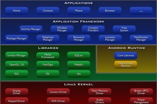 The document discusses Android application development. It provides an overview of the Android platform, including that it is an open source software stack for mobile devices powered by Linux. It describes the installation of development tools like Eclipse and the Android SDK. It then covers the basic building blocks for Android apps like activities, services, intents, and content providers.