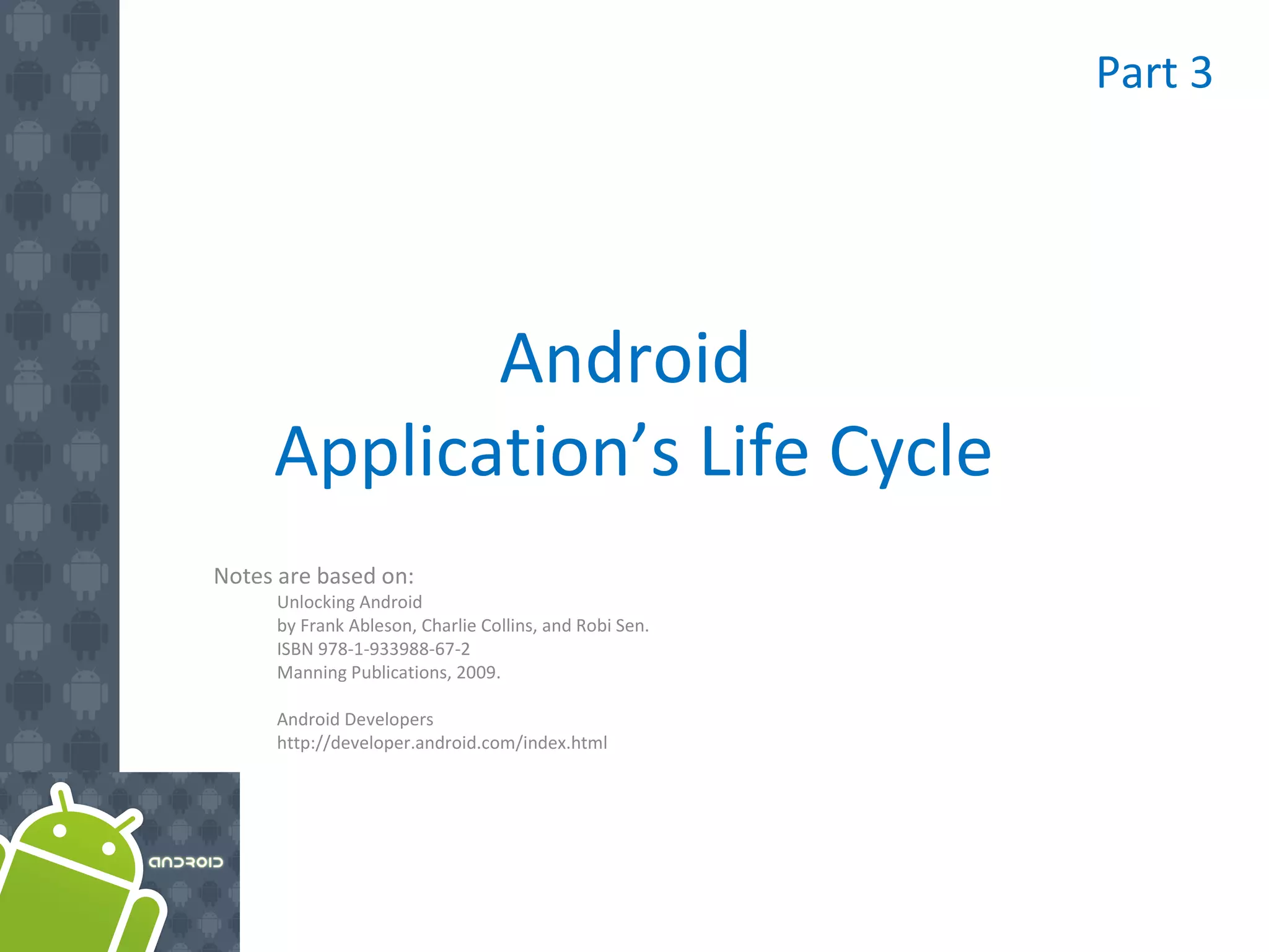 Tài liệu trình bày về vòng đời ứng dụng Android, bao gồm các thành phần như activity, service, broadcast receiver và content provider. Nó giải thích các trạng thái vòng đời của ứng dụng và cách quản lý các hoạt động thông qua các phương thức như onCreate(), onStart() và onDestroy(). Qua đó, tài liệu nhấn mạnh tầm quan trọng của việc quản lý vòng đời để cải thiện trải nghiệm người dùng.