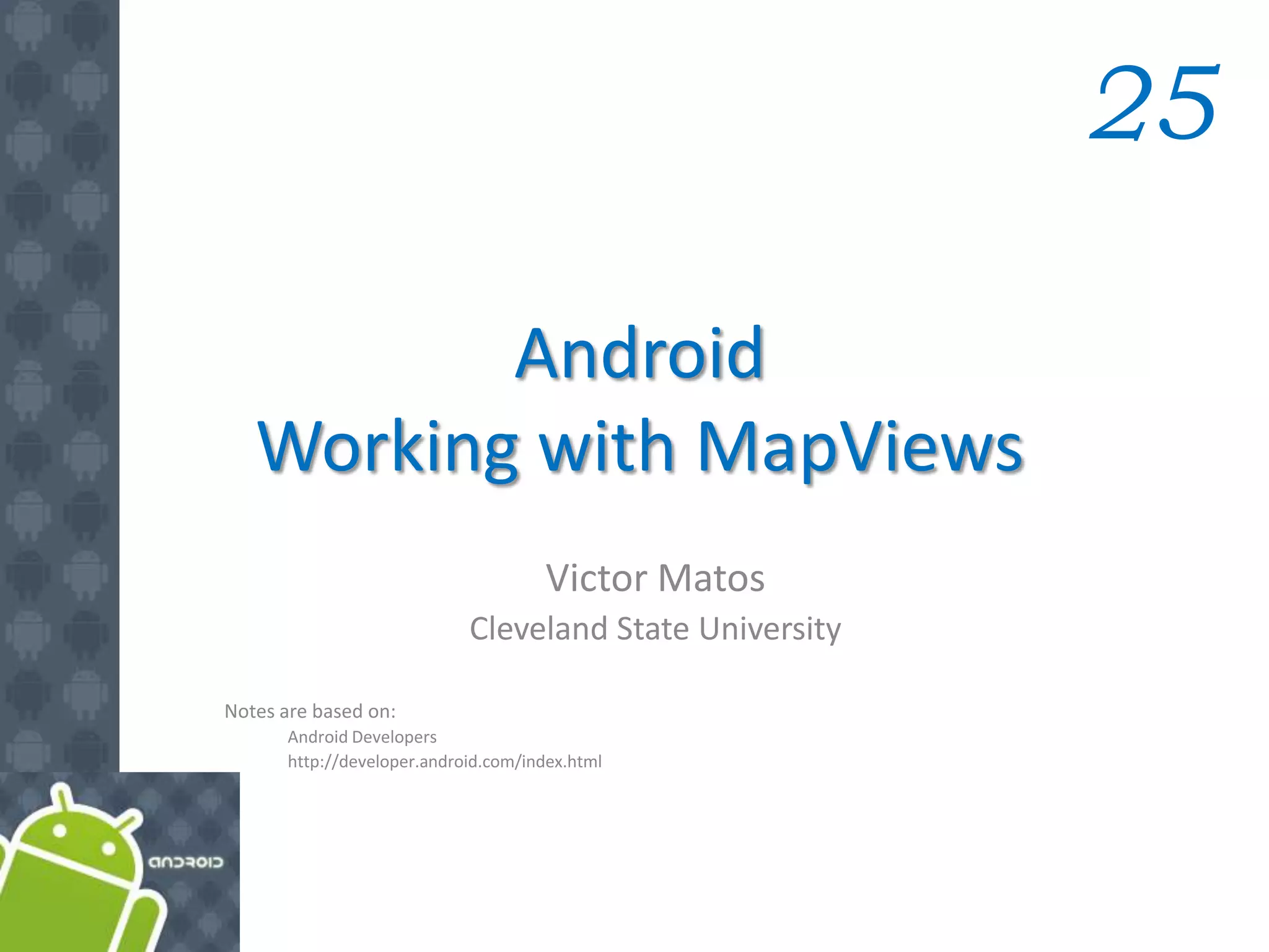 The document discusses Android MapViews and using the Google Maps external library in Android applications. It provides tutorials for creating a basic map activity with MapView, adding overlays to the map, and using the Geocoder class to geocode addresses and reverse geocode latitude/longitude coordinates. The tutorials demonstrate how to display a map, center it on coordinates, add overlay items, and retrieve address data from latitude/longitude values or perform reverse geocoding from an address.