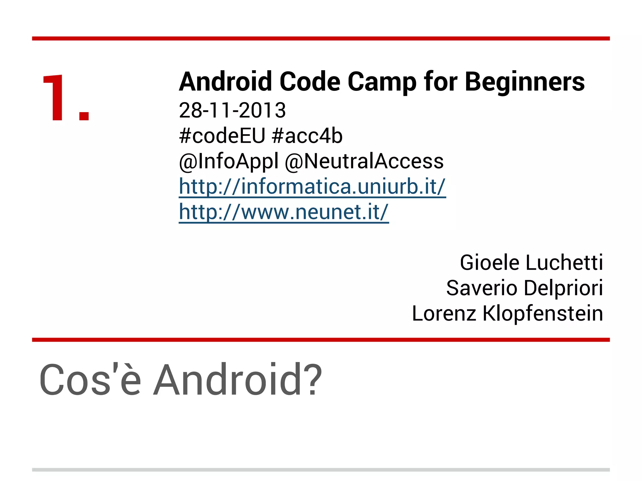 Il documento presenta una panoramica sul sistema operativo Android, la sua storia, le caratteristiche principali e le sue API. Fondato nel 2003 e acquisito da Google nel 2005, Android ha evoluto rapidamente, diventando il leader nel mercato dei dispositivi mobili. Il testo approfondisce come le applicazioni vengano sviluppate utilizzando Java e le API di Android, evidenziando i principali componenti e il ciclo di vita delle applicazioni.