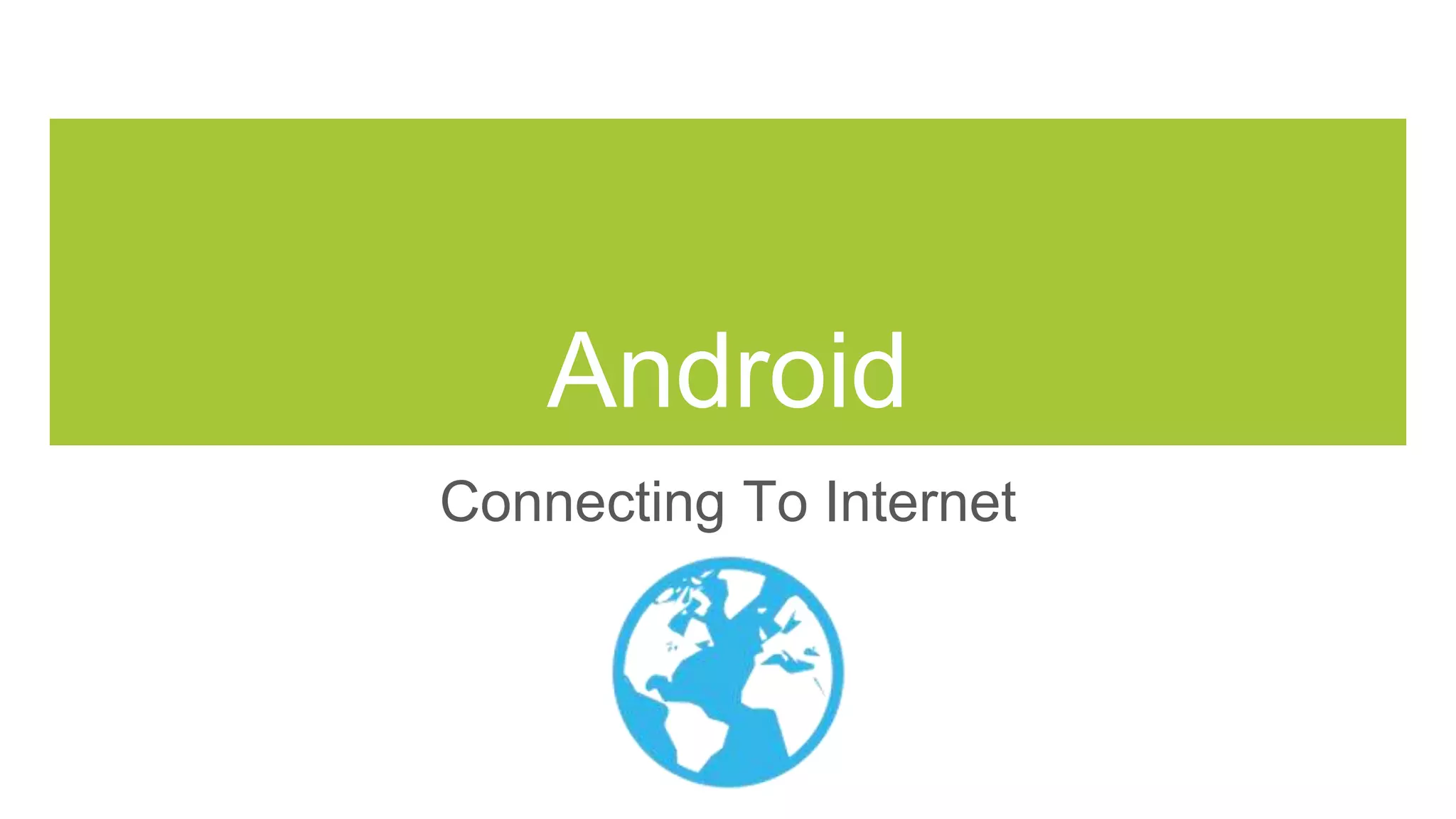 The document discusses connecting Android apps to the internet. It explains that apps can be standalone or connected, with connected apps requiring an internet connection to sync data, access user accounts, and more. It then covers how to check the network connection status and permissions needed to connect. The document demonstrates how to make a URL connection to retrieve data from a server, including opening the connection and reading the input stream response.