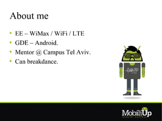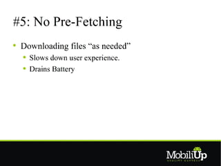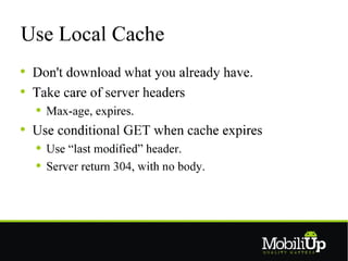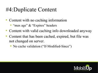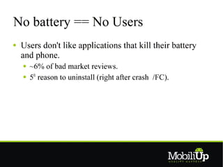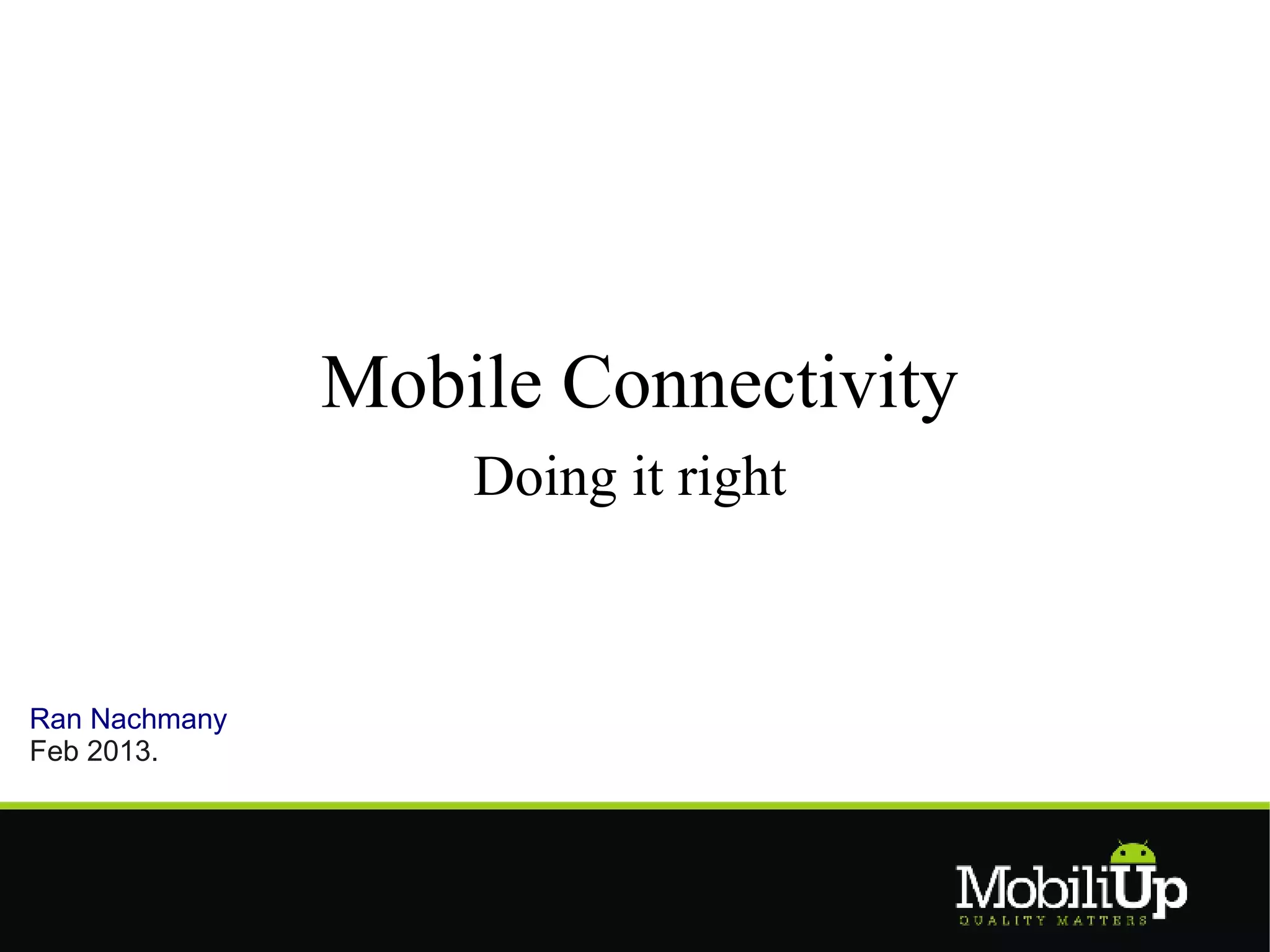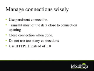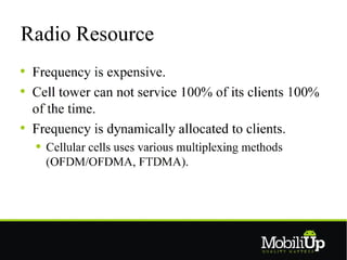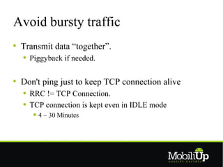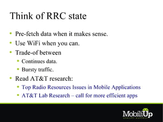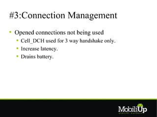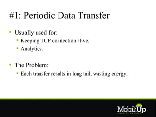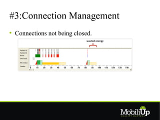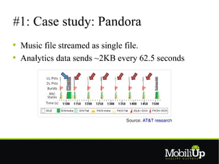 The document discusses mobile connectivity, particularly the radio state machine and its energy consumption. It presents a case study on Pandora, highlighting that only 0.2% of data consumed led to 46% of energy usage. The presentation includes graphics and is part of a discussion on optimizing mobile connectivity.