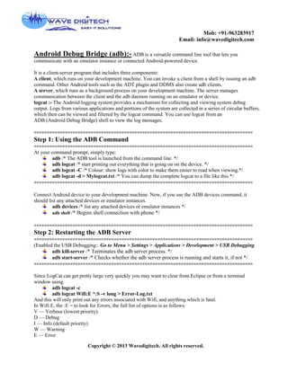 The document provides an overview of the Android Debug Bridge (adb), which is a command line tool that allows communication with Android devices and emulators, featuring client-server architecture. It covers various adb commands for tasks such as viewing logs with logcat, managing devices, installing/uninstalling applications, backing up and restoring data, and rebooting devices. Practical examples of command usage are included, demonstrating how to perform these actions effectively.