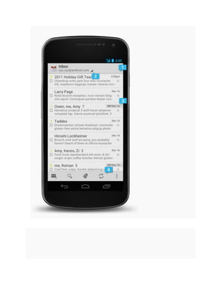 The document outlines Android design principles, emphasizing the importance of aesthetics, simplicity, and user empowerment in app development. It introduces key elements of the user interface, including home screens, notifications, and various UI components, as well as design metrics like typography, color, and iconography. The document ultimately aims to guide developers in creating visually appealing and functional applications that enhance user experience across diverse devices.