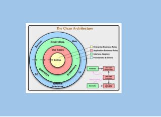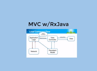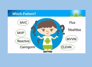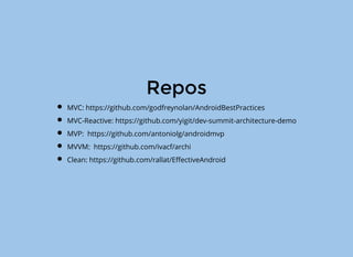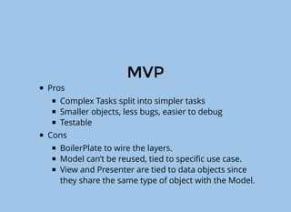The document discusses various Android application architecture patterns, including MVC, MVP, and MVVM, highlighting their pros and cons. It emphasizes the importance of scalability, maintainability, and testing while providing code examples to illustrate each pattern's implementation. Additionally, it touches on the advantages of reactive programming and clean architecture for better decoupling and reusability.