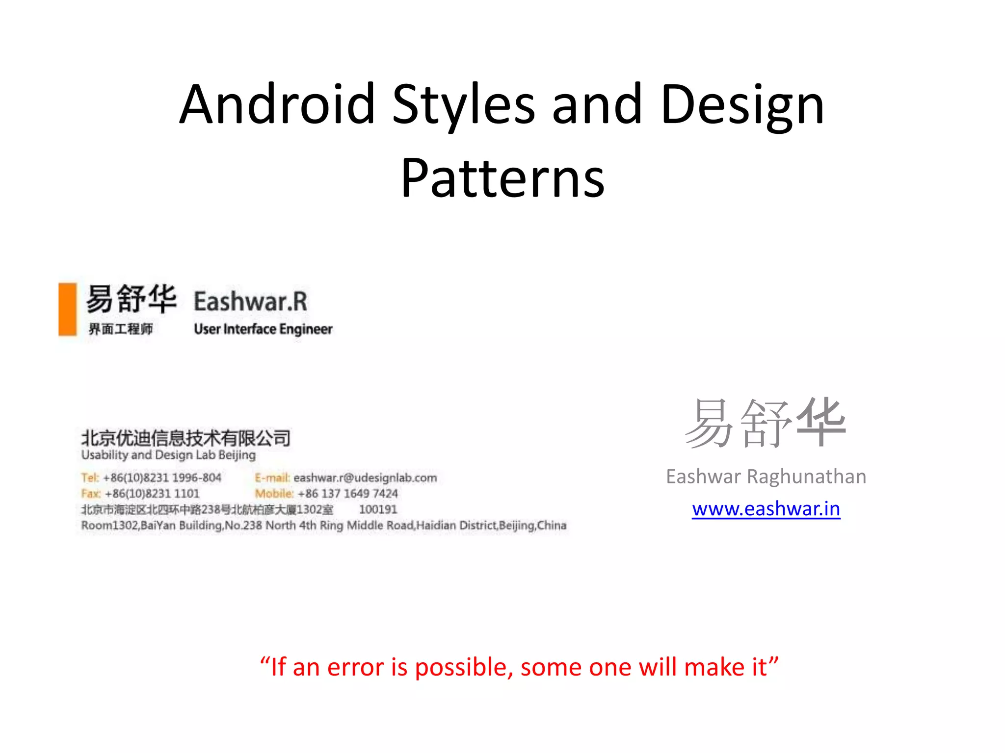 The document discusses 3 key themes in Android design: gestures, navigation, and touch feedback. It outlines several pre-defined gestures like touch, long press, and swipe. It also covers navigation between activities using back and up buttons, and the difference between back and up. Finally, it mentions touch feedback principles like grid rules and button architecture.