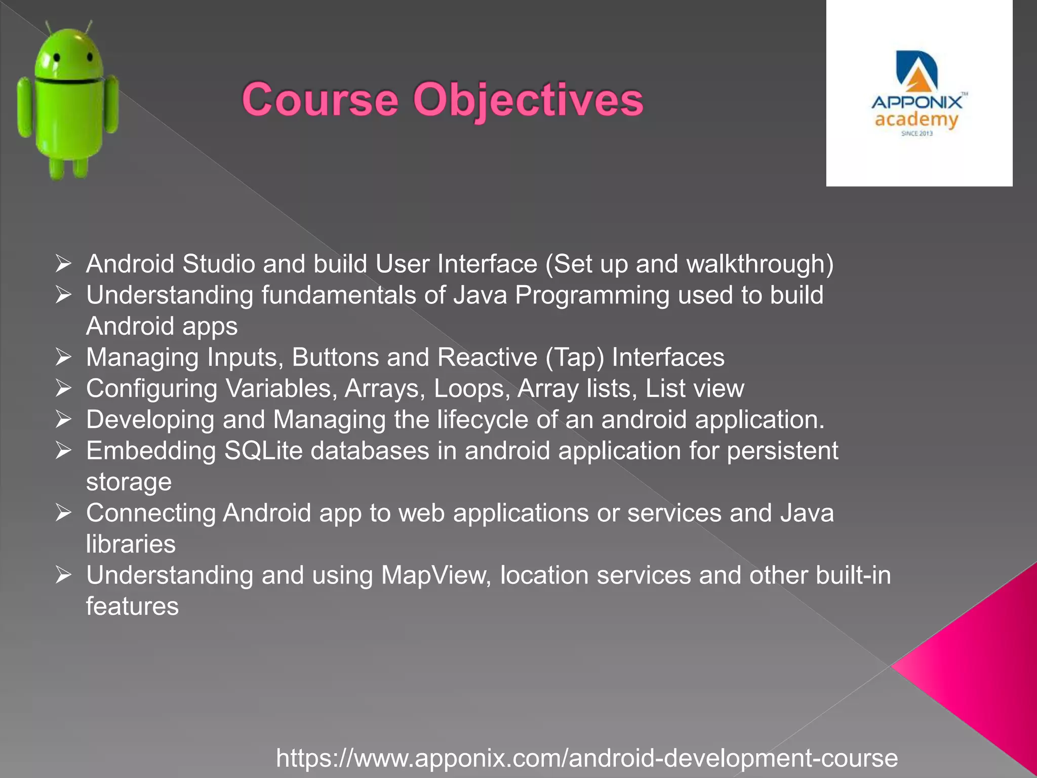 It also provides details on career opportunities and salaries for Android developers after completing the course.