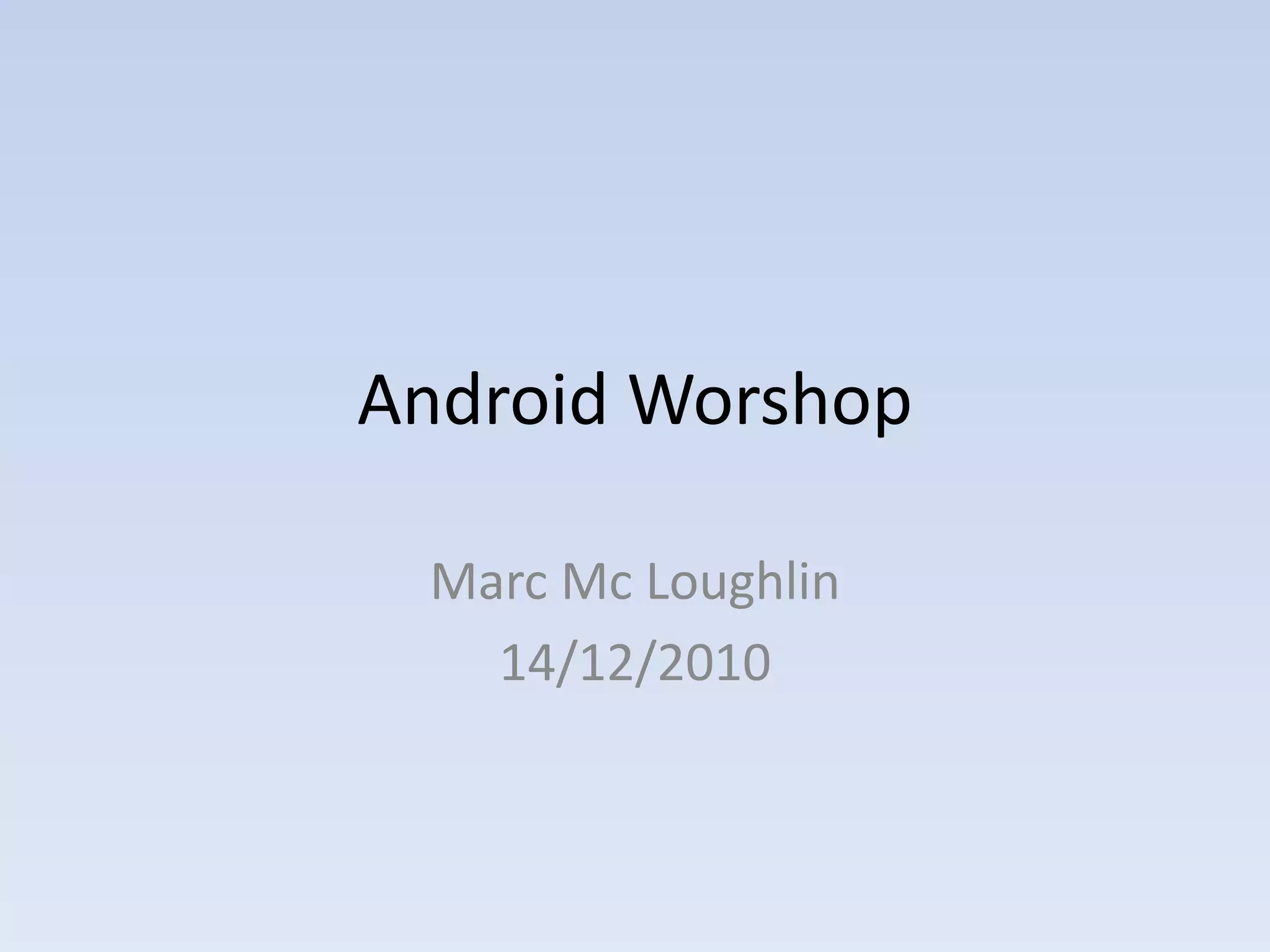 The document provides an overview of setting up an Android development environment and creating basic Android applications. It discusses installing the Android SDK and Eclipse IDE, creating Android Virtual Devices, using the Android emulator, and understanding key Android application components like activities, services, and intents. The document also covers building user interfaces with XML layouts, handling user input, and moving between activities.