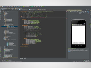 The document discusses the process and tools for Android development. It covers setting up the development environment with Java JDK, Android Studio, Android SDK Manager, and AVD Manager. It then explains creating an Android project structure with the main Java source code folder and resource folder. The document also discusses the AndroidManifest.xml file, build.gradle file, and creating a "Hello World" app.