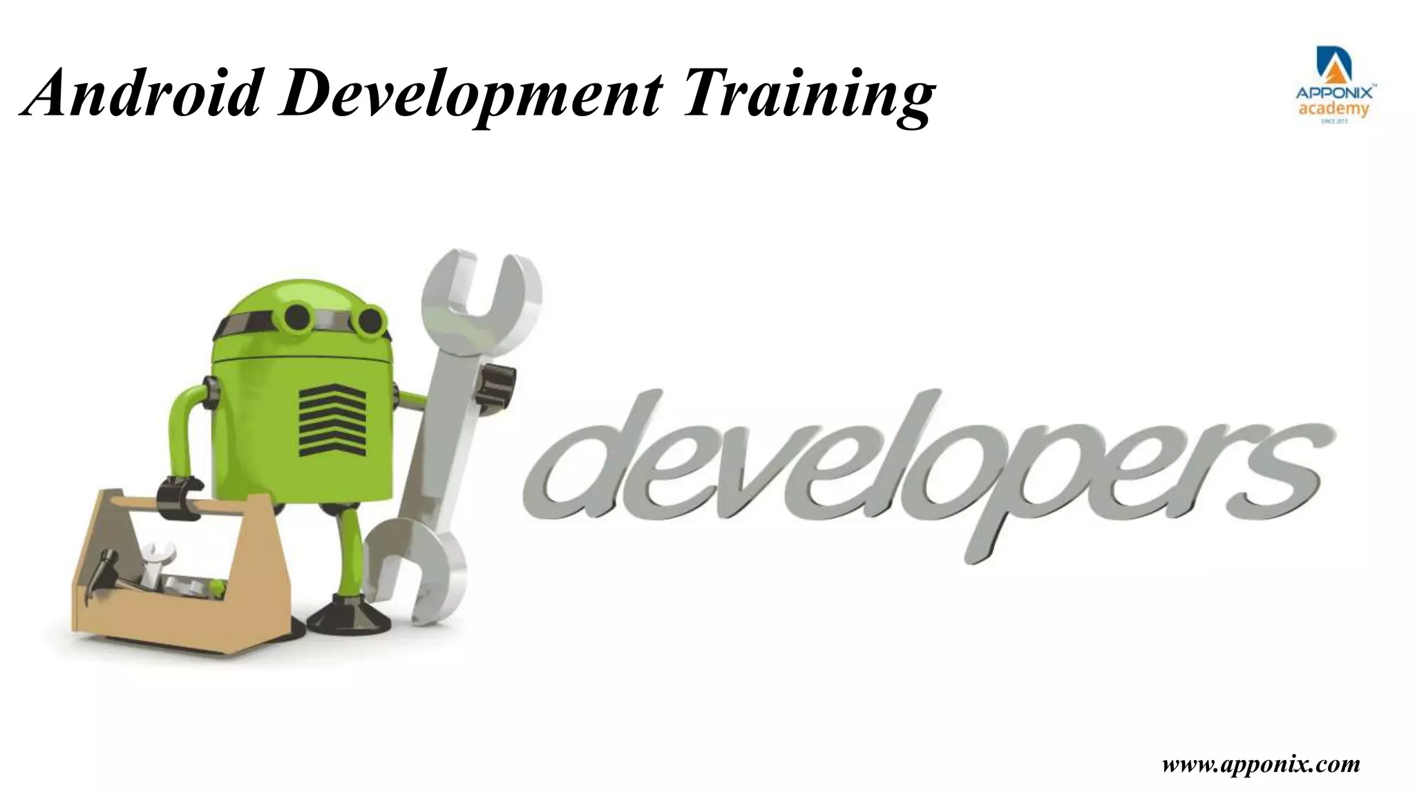 This document outlines the objectives and topics covered in an Android development training course offered by www.apponix.com. The training will cover setting up Android Studio, Java programming fundamentals, building user interfaces, managing inputs and buttons, using variables and arrays, the app lifecycle, SQLite databases, connecting to web services, maps and location services, deploying apps, XML layouts, different screen sizes and rotations, keyboard and touch inputs, and displaying notifications. It also describes the Associate Android Developer certification exam, expected salary range after completion, and high job demand and opportunities for Android developers.