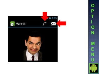 This document provides instructions for a sample Android project called Mark-8. It describes two screens: Screen 1 displays an image and information and links to Screen 2; Screen 2 accepts user input to update the information from Screen 1. It also describes adding a menu with options for Call, SMS, and Exit. The SMS option opens a dialog screen. Finally, it provides instructions for adding a grid view with images and opening a new activity when an item is selected.
