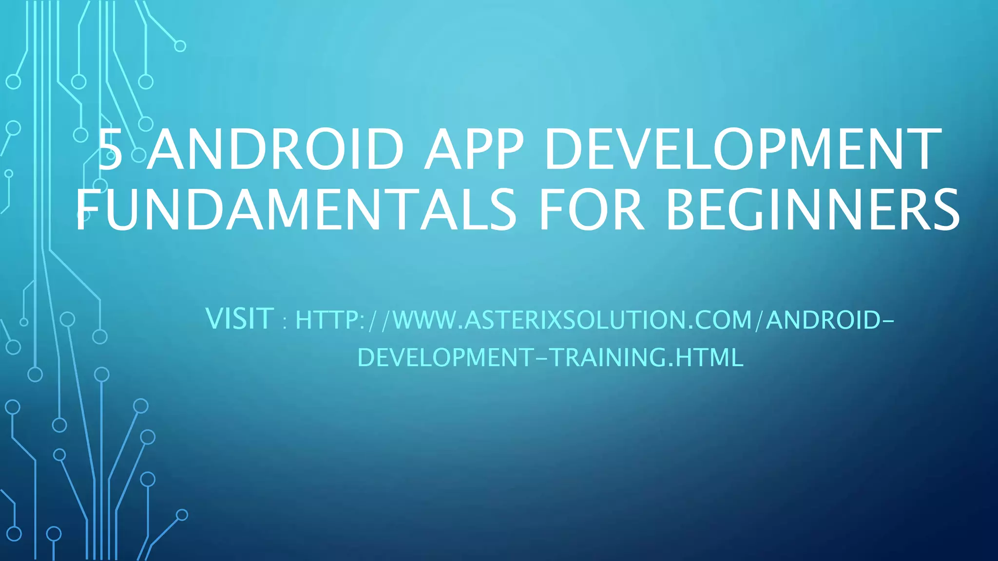 The document outlines five essential fundamentals for beginners in Android app development, including mastering Java and XML, familiarity with development tools, understanding application components, awareness of platform fragmentation, and choosing the right tools. It emphasizes that knowledge of these areas is crucial for creating effective and responsive applications. Additionally, the document mentions opportunities in the field and suggests a certified training course for further skill development.