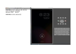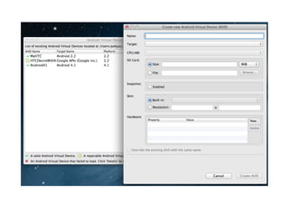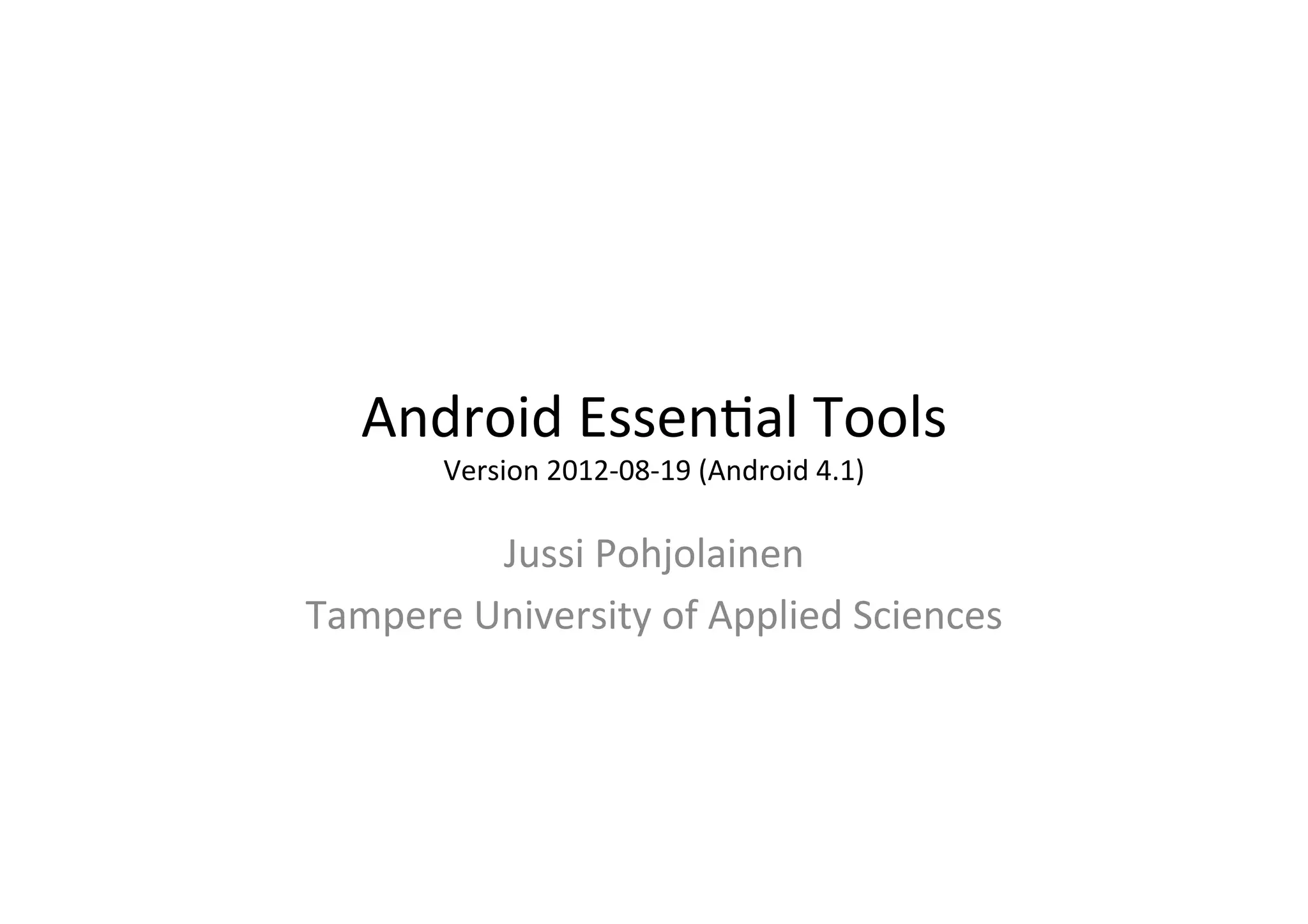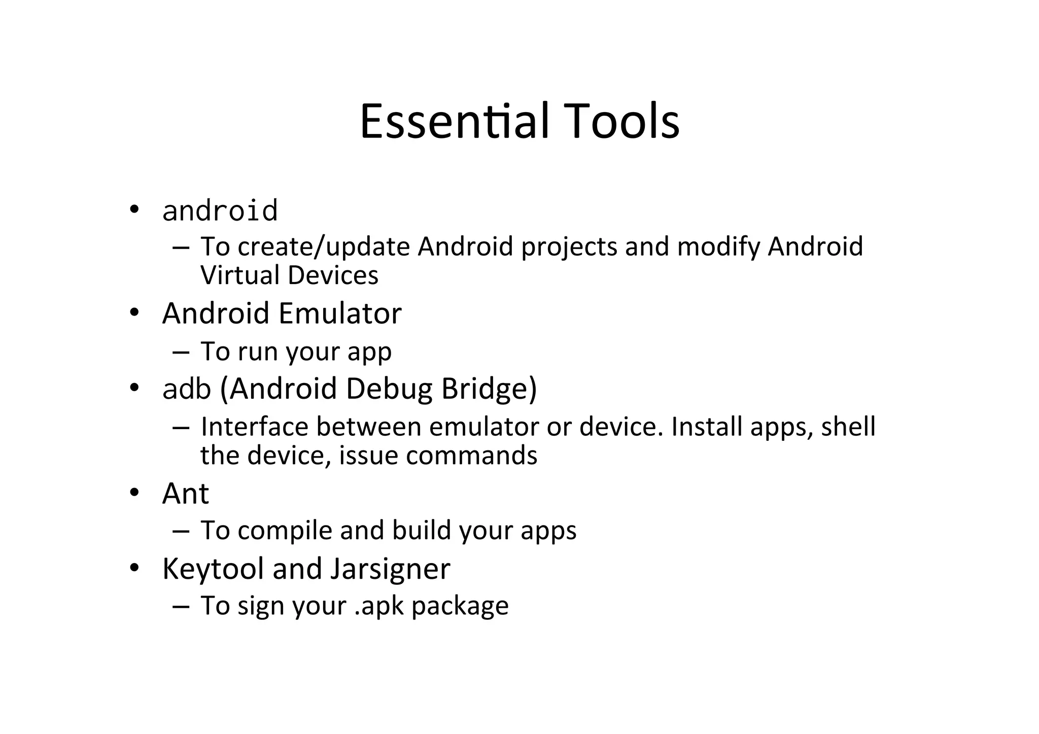 The document discusses essential tools for Android development including Android Studio, the Android Emulator, adb, Ant, Keytool, and Jarsigner. It provides steps for creating an Android project, building debug and release versions, configuring an Android Virtual Device (AVD) in the emulator, and installing an app package (.apk) onto an emulator or device using adb.