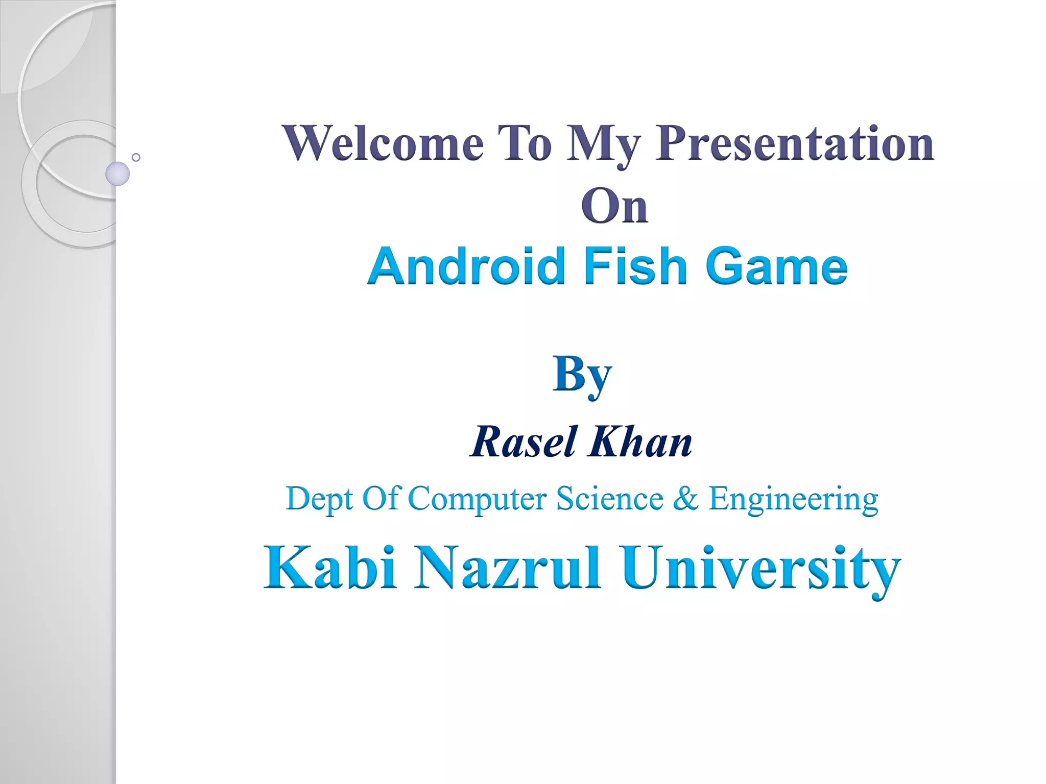 The document summarizes Rasel Khan's presentation on developing an Android fish game. It includes sections on the objectives to create a game where the player's fish eats other fish to grow and levels up while avoiding obstacles. It discusses the background studies, game development life cycle, planning, analysis, design, and development phases. The presentation provides examples of the layout, control panel, scoring, and help designs for the fish game.