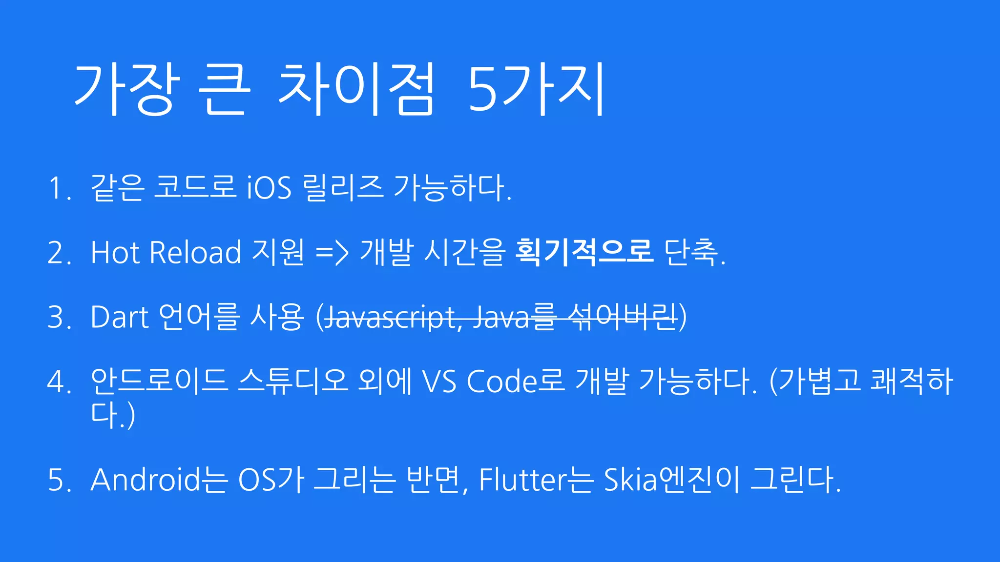 5. Android는 OS가 그리는 반면, Flutter는 Skia엔진이 그린다.