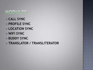 This document describes several modules for an automated call and location management application, including call blocking/whitelisting, location-based call rules, automatic profile switching, location sharing, WiFi hotspot connection, auto-responding to calls based on location, and contact alerts when near saved locations. It also includes a translator module to translate messages to the local language. The application aims to simplify management of calls and profiles based on location to avoid manually changing settings.