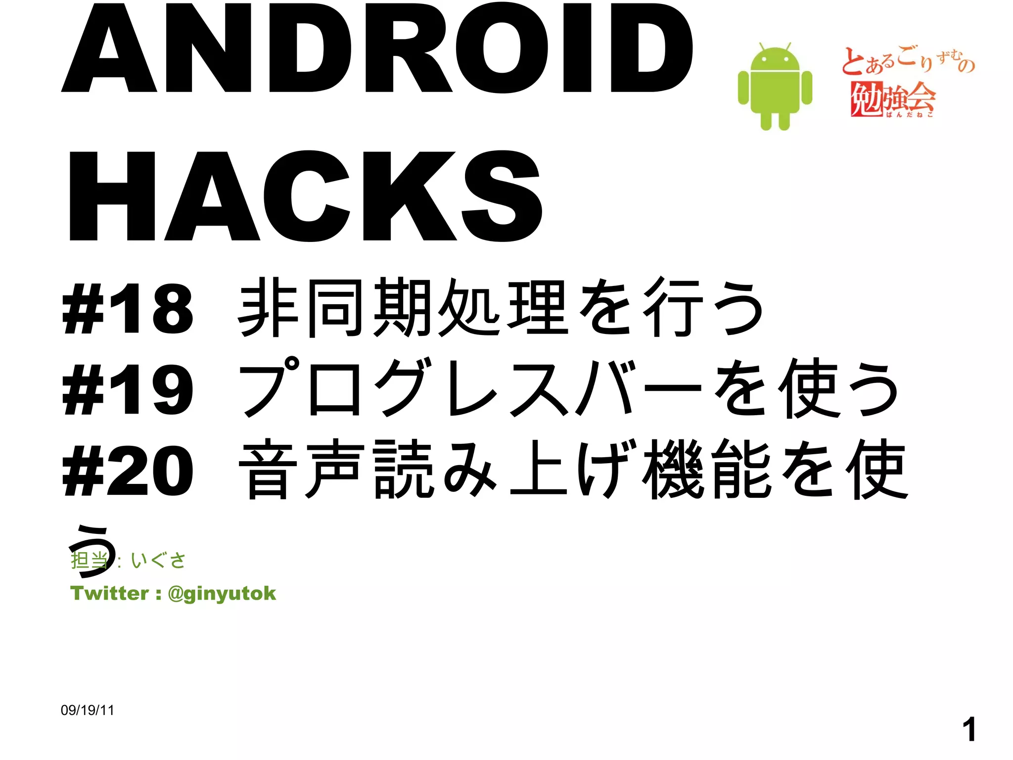 ANDROID HACKS #18  非同期処理を行う #19  プログレスバーを使う #20  音声読み上げ機能を使う 担当:いぐさ Twitter : @ginyutok 09/19/11