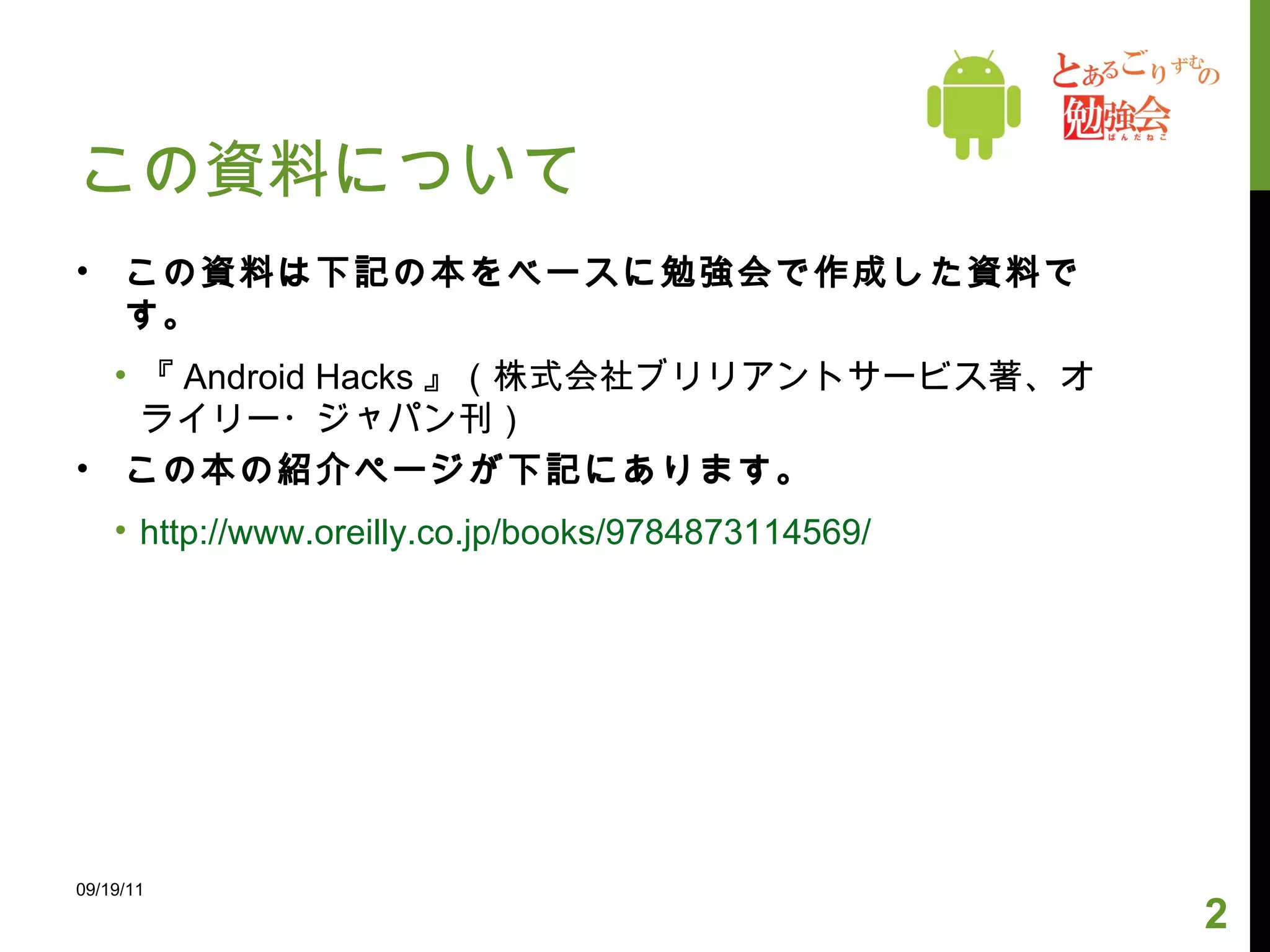 この資料について この資料は下記の本をベースに勉強会で作成した資料です。 『 Android Hacks 』(株式会社ブリリアントサービス著、オライリー・ジャパン刊) この本の紹介ページが下記にあります。 http://www.oreilly.co.jp/books/9784873114569/ 09/19/11