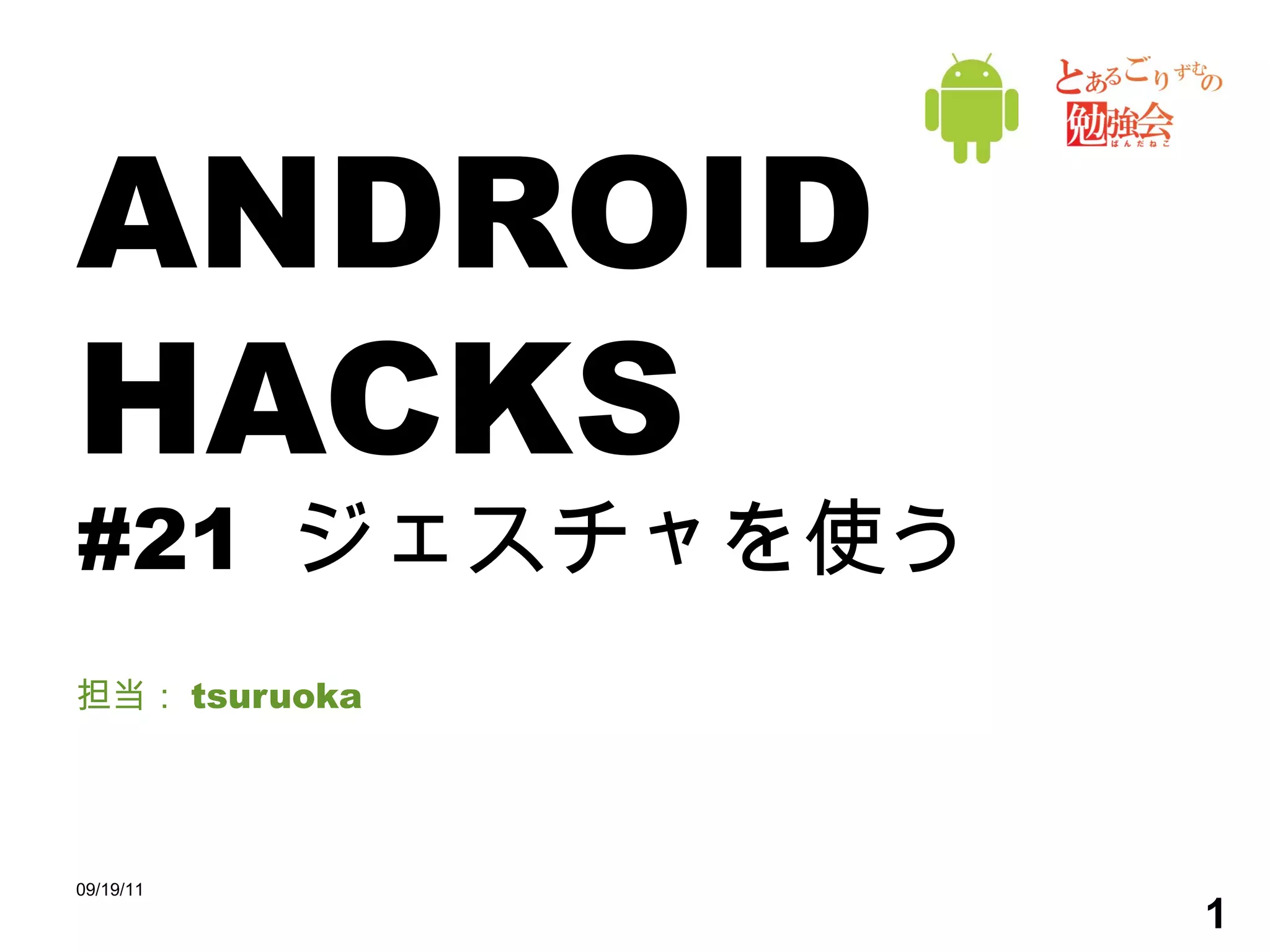 Hack21 登録されたジェスチャの実装 publicvoid onGesturePerformed(GestureOverlayView overlay, Gesture gesture) { Log. d ("mydgb", "onGesturePerformed"); ArrayList<Prediction> predictions = mLibrary.recognize(gesture); // We want at least one prediction if (predictions.size() > 0) { Prediction prediction = predictions.get(0); // We want at least some confidence in the result if (prediction.score > 1.0) { // Show the spell Toast. makeText (this, prediction.name, Toast. LENGTH_SHORT ).show(); } }else{ Toast. makeText (this, "Such gesture isn't registered.", Toast. LENGTH_SHORT ).show(); } }