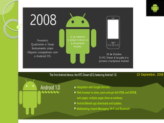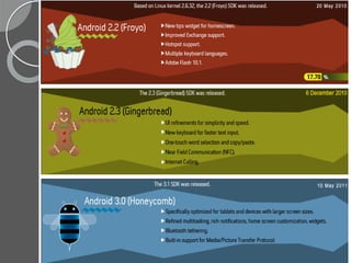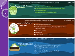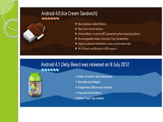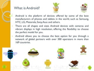 Android is an open-source operating system used by many manufacturers for phones and tablets. It was founded in 2003 by Andy Rubin to create smarter mobile devices aware of users' preferences and locations. Android is powered by the Linux kernel and allows flexibility through options from global partners. The evolution of Android saw versions like KitKat in 2007 and Android L Developer Preview in 2014.