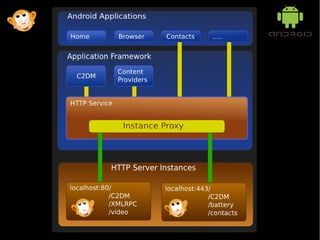 The document proposes adding an HTTP service layer to the Android application framework to allow applications and framework components to expose their own web services through a lightweight component. It suggests using the Monkey HTTP daemon as the web server process due to its small size, asynchronous and plugin-based design, and performance on ARM devices. The HTTP service would be an Android application that exports an API for registering services and handling communication between requesters and server instances.