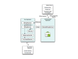 The document provides an overview of in-app billing for Android apps. It discusses the Google Play Billing Service, including the different request types developers can make like check billing supported, request purchase, get purchase information, and restore transactions. It also covers the Android Billing Library, which is an open-source library that implements the billing service and includes features like automatic confirmation handling and an obfuscated purchase database. The document concludes with a discussion of security best practices for in-app billing like using random nonces, obfuscating purchase data, embedding the public key securely, applying code obfuscation, and performing signature validation on a server.