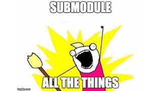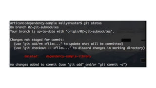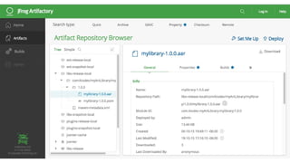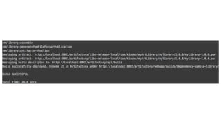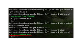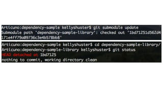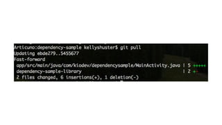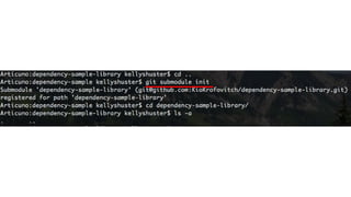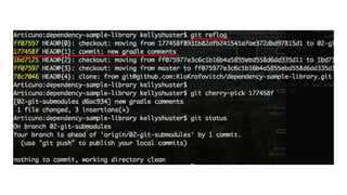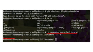 1. The document discusses different approaches for managing internal library dependencies in Android projects, including having a single repository with one or multiple gradle modules, using git submodules across multiple repositories, and linking repositories with Maven through a local Artifactory server.