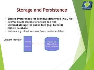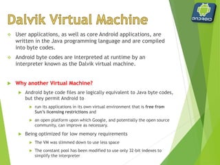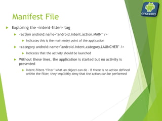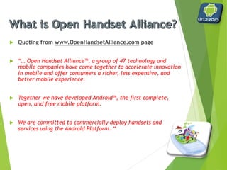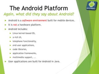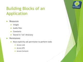 The document provides an introduction and overview of developing Android applications. It discusses what Android is, the major Android application components of Activities, Services, Intents, and Content Providers. It outlines the Android development environment, including installing the SDK and creating a sample "Hello World" application. It also covers the key parts of an Android project like the AndroidManifest file, resources, and source code directories. The document aims to guide users through the essentials of Android application development without assuming prior Java knowledge.