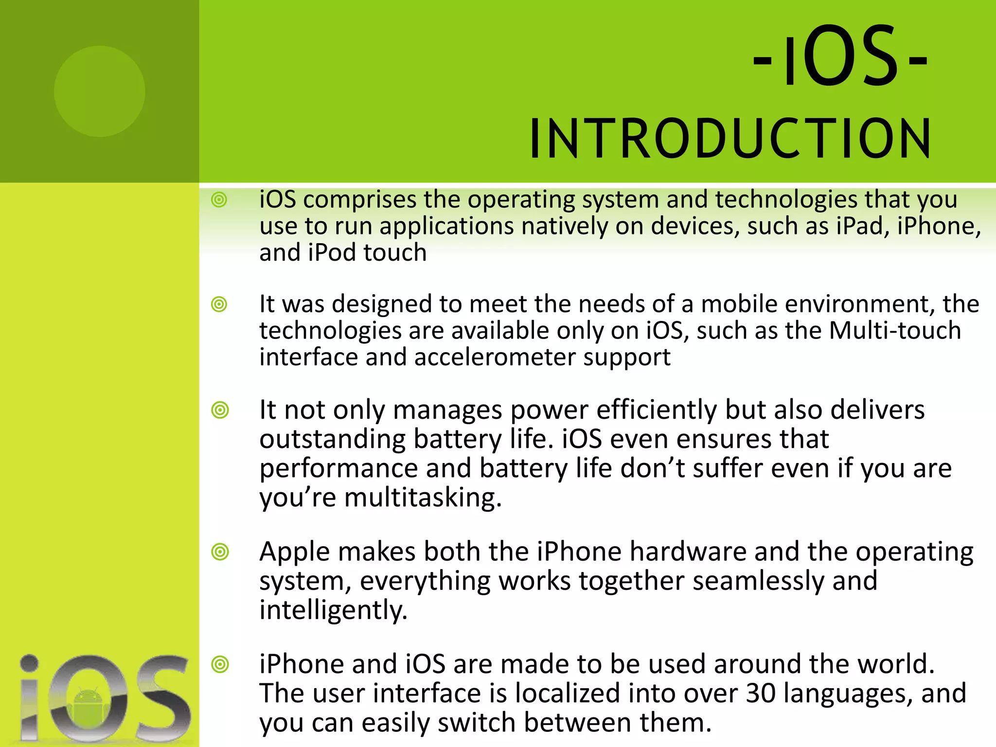 iOS provides a polished, consistent experience across Apple devices where apps generally work smoothly and bugs are quickly fixed. However, it offers less customization than Android. Android allows for high levels of customization but can be less stable due to its fragmentation across devices and versions. While Android offers more options and unique features from manufacturers, iOS typically receives higher quality apps sooner and has more secure app validation processes.