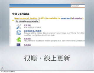 The document discusses the use of Jenkins for continuous integration in Android development, emphasizing various coding practices, version control, and issue tracking. It mentions tools and configurations such as Ant, JUnit, and project structuring. Additionally, it highlights the integration of open-source applications and automation processes in software development.