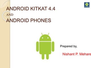 Android KitKat 4.4 introduced several design changes including using a neutral gray color scheme instead of blue, enabling applications to use the full screen in two modes, and adding translucent system bars to display more application content. It also defined new gestures like a double touch drag for pinch zoom and incorporated support for step detection and counting sensors. The document provided background on Android's history and architecture before detailing these interface enhancements in KitKat.