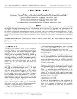 The document discusses the increasing prevalence of Android devices and the associated security threats they face, including various malware attacks. It outlines specific attack methods such as message stealing, application phishing, and using social media as command and control channels. Additionally, it proposes potential countermeasures and highlights the need for improved security measures within the Android framework to protect users' personal information.
