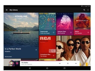 This document provides an overview of Material Design and the Android M preview. It discusses the goals of Material Design including a unified experience across platforms. It outlines several principles of Material Design such as using motion to provide meaning and responding to user interactions. It also provides examples of style guidelines for color, iconography, imagery, and typography. Additionally, it covers several features from the Android M preview like app permissions, biometric security, Google Now on Tap and Chrome integration. The document is intended to introduce developers to Material Design and the updated features in the Android M software development kit preview.