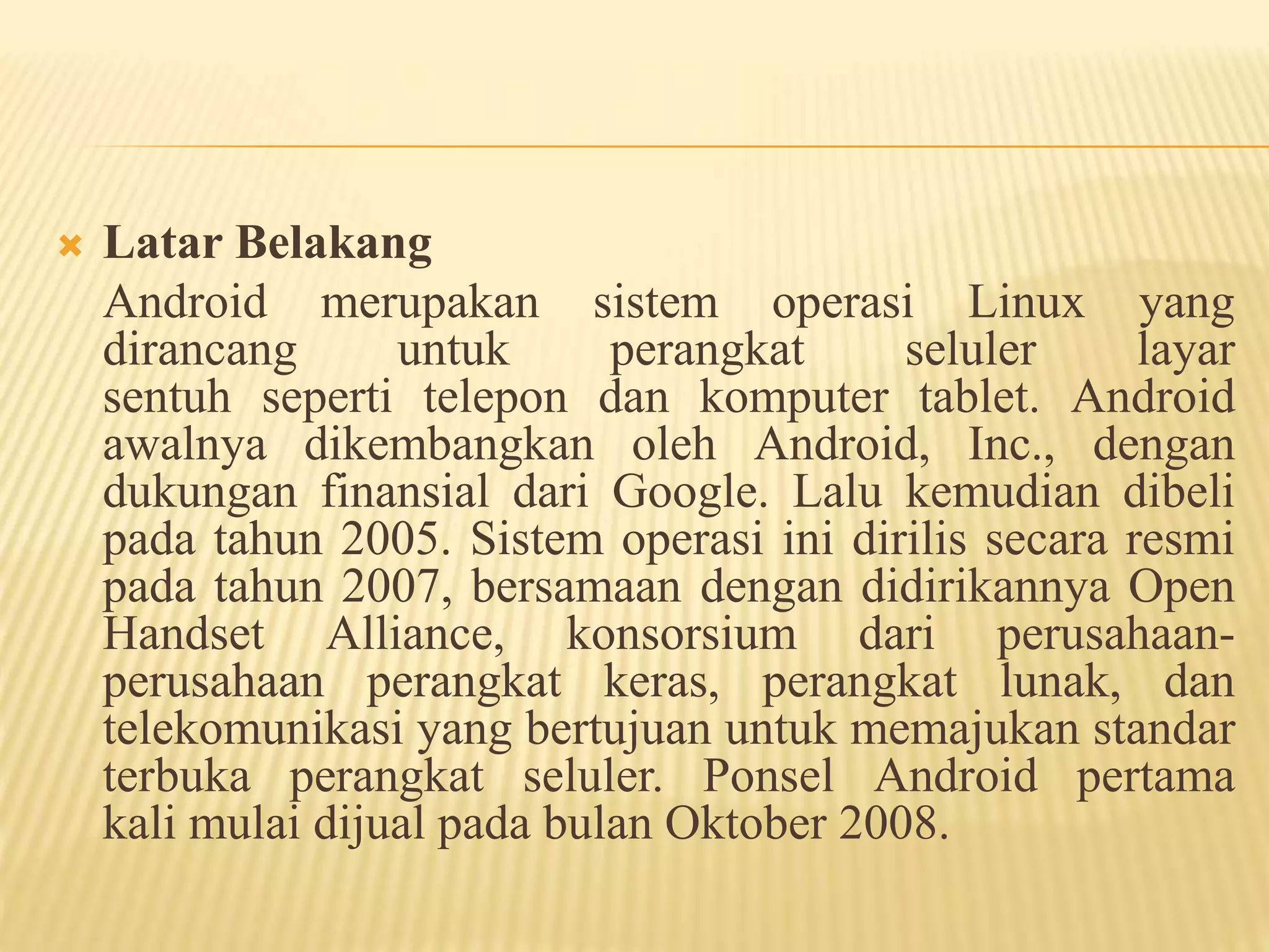 1. Android adalah sistem operasi berbasis Linux yang dirancang untuk perangkat seluler sentuh seperti telepon dan tablet.