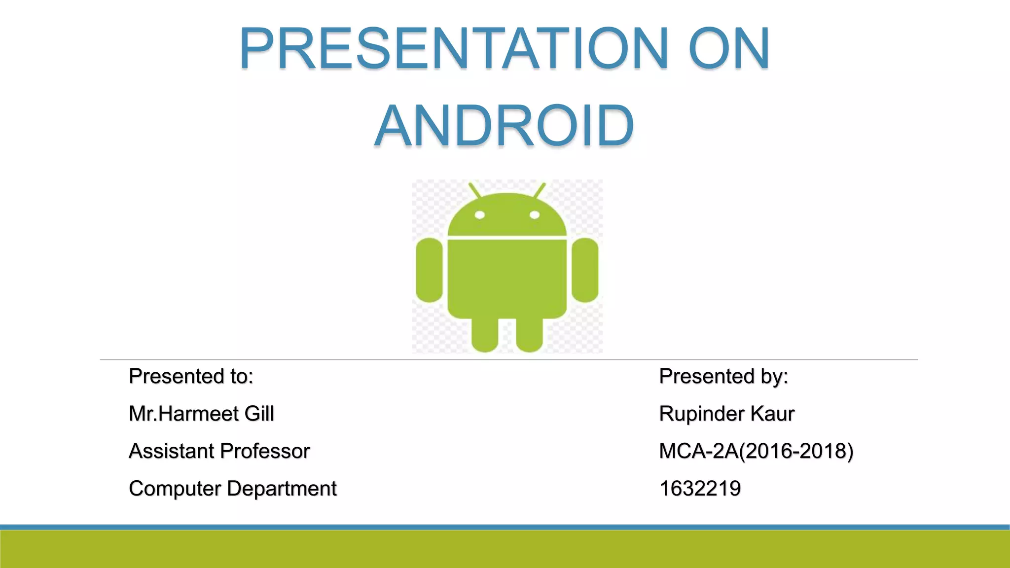 1) The presentation provides an introduction to Android, an open source software platform and operating system for mobile devices developed by Google.