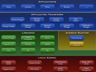 Android is an open-source software platform based on the Linux kernel. It was developed by Android Inc which was bought by Google in 2005. The first Android device, the HTC Dream, was released in 2008. Key aspects of Android include support for a variety of hardware, an open development platform, and a multi-app sandboxed environment. Future possibilities for Android include wider adoption across devices and Nokia releasing Android phones.